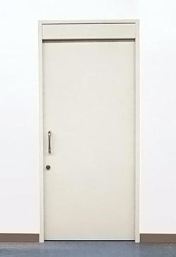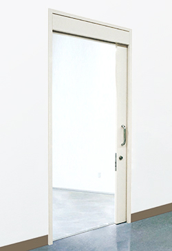 扉、枠とも1.6mmの鋼板を使用し、ストップ保持なしの自閉装置内蔵の片引きのみで、構造規定(例示仕様)による防火設備(網入りガラス窓つき)・ 特定防火設備(窓なし)の要件をクリアしています※。枠やレールはアンカーによる溶接固定の他、補強枠に対してネジ固定できるフラ ンジ付も選択できます。また、塗装も錆止めの他、アクリル樹脂焼付塗装(指定色可)や粉体焼付塗装(当社指定色のみ)も自社工場内設備にて塗装して出荷します。